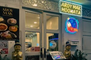 At Aroy Mak, the start of the evening is marked by a distinctive sound that signals the beginning of the meal. It is not the clatter of cutlery or the murmur of conversation, though those are present. It is the quiet, steady sizzle of a cube of pork lard sliding down the heated dome of…